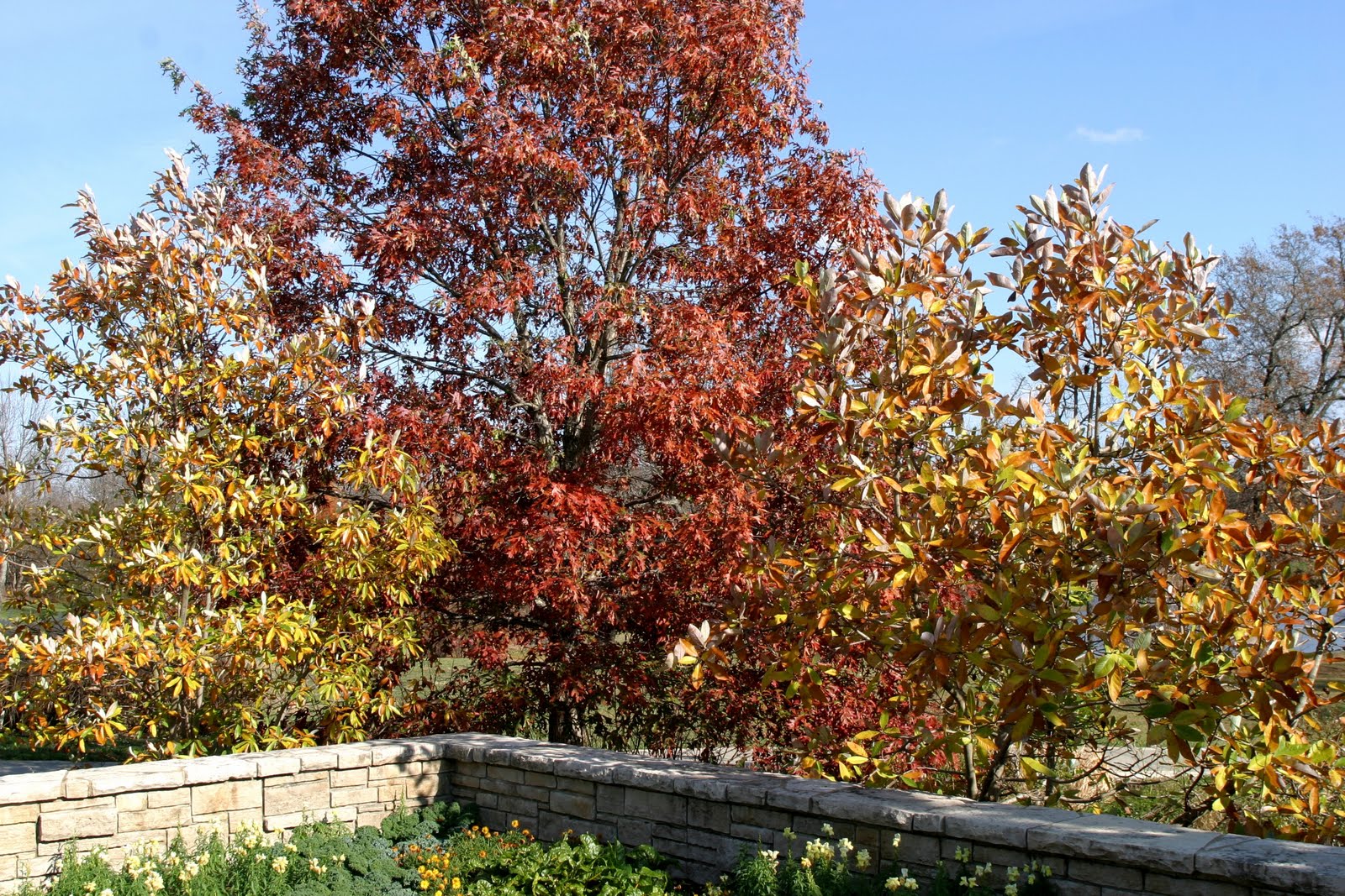 The White Oak (Quercus alba) on the north side of the Visitor Center is at peak of color in burnt reds; and flanked by Sweetbays (Magnolia virginiana) in the best golden attire.
